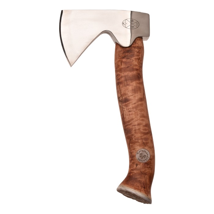 Skaft i betsad masurbjörk, varav avslutet på skaftet är tillverkat i renhorn. Huvudet i blankpolerat, rostfritt stål. Vacker handgjord jaktyxa av stor modell som är optimal för användning vid jakt och relaterade sysslor. Använd jaktyxan till att skinna ett större djur.