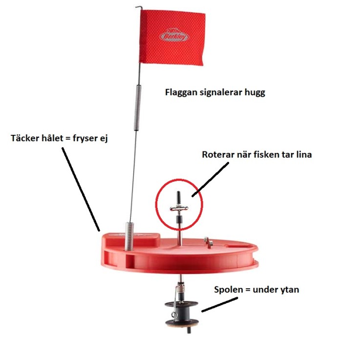 För att man ska se om fisken tar lina utan att behöva lyfta på hela enheten, roterar den genomgående spolaxeln även på ovansidan isen. Flaggan är extra hög så man enkelt ska se när det är napp, även om det skulle var snö på isen.