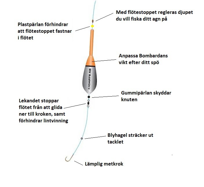 flötestopp (eller stoppknut) plastpärla, gummipärla, lekande, eventuellt blyhagel, lämplig krok