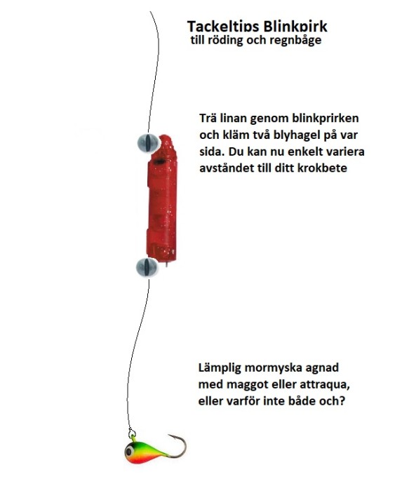 Dubbelblinkande blinkpirk, har två diod lampor som börjar blinka i kontakt med vatten, extremt lockande på arter som röding och regnbåge men även öring.