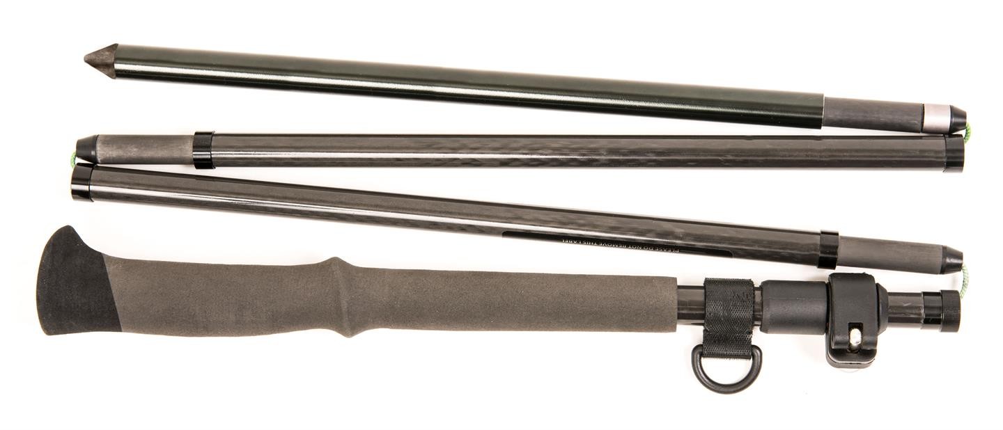 Kompakt fällbar vadarstav som är lätt men stabil och tillverkad av styv grafit med en tålig nedre sektion av aluminium samt en hård spets av tungsten. Staven är 36 centimeter lång ihopfälld när den förvaras i det medföljande fodralet. Helt utfälld mäter den 147 centimeter och är försedd med två olika låsanordningar för maximal säkerhet vid svår vadning. I övre änden sitter ett greppvänligt handtag av EVA med två olika greppytor som låter dig hitta ett perfekt läge för din hand. Den undre är rund medan den övre delen är formad efter en hand på samma sätt som en skidstav.