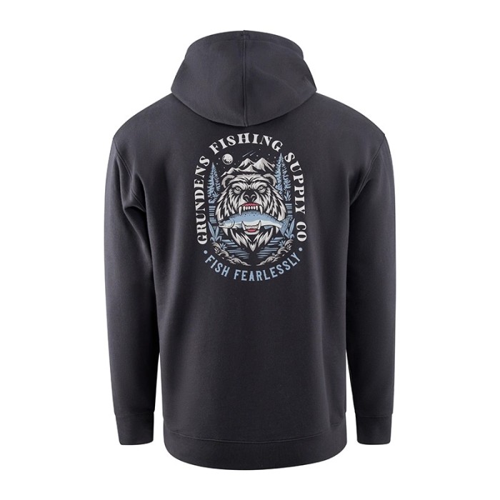 Den iögonfallande grafiken lyfter fram fiskets hantverk och naturens egen expertis. Samtidigt ger hoodien en avslappnad och bekväm känsla som passar lika bra under fiskepasset som vid stugan eller på väg hem från vattnet.