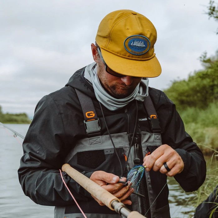 Den är tillverkad i en slitstark nylon- och bomullsblandning som ger bra ventilation och komfort under långa dagar utomhus. Materialet erbjuder även UPF 50+ solskydd, vilket gör kepsen till ett praktiskt val både på sjön och vid kusten. Designen kombinerar enkel retrostil med tydlig koppling till Grundéns arv och funktionella fiskeplagg.