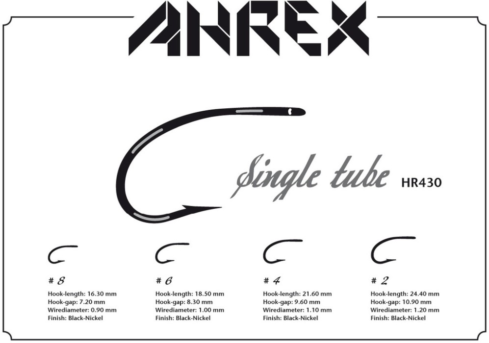 Ahrex HR430 är en enkelkrok för tubflugor med kort skaft, brett krokgap och med ett smalt kroköga, vilket gör det enkelt att trä in kroken i dina tubflugor.