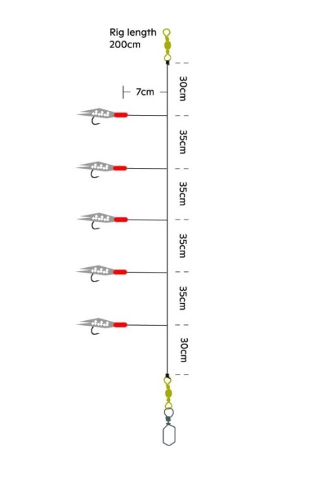 - Färdigriggat tackel med fem krokar