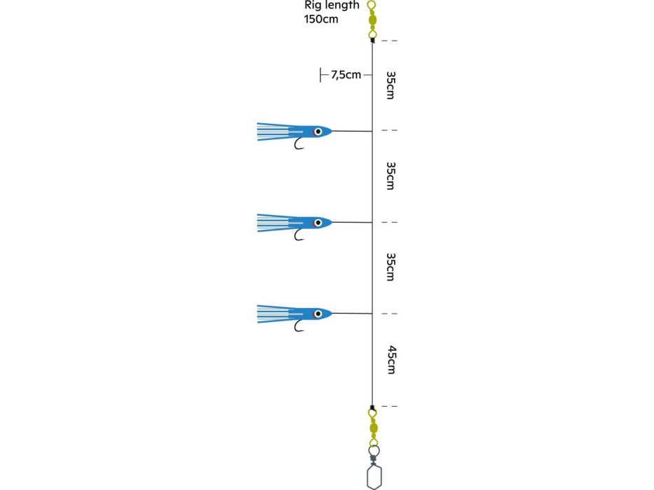 Dessa färdiga tackel med silikonbläckfiskar erbjuder en av de mest populära kombinationerna för havsfiske. Tre starka krokar kombineras med fantastiska färger och högkvalitativ nylonlina.