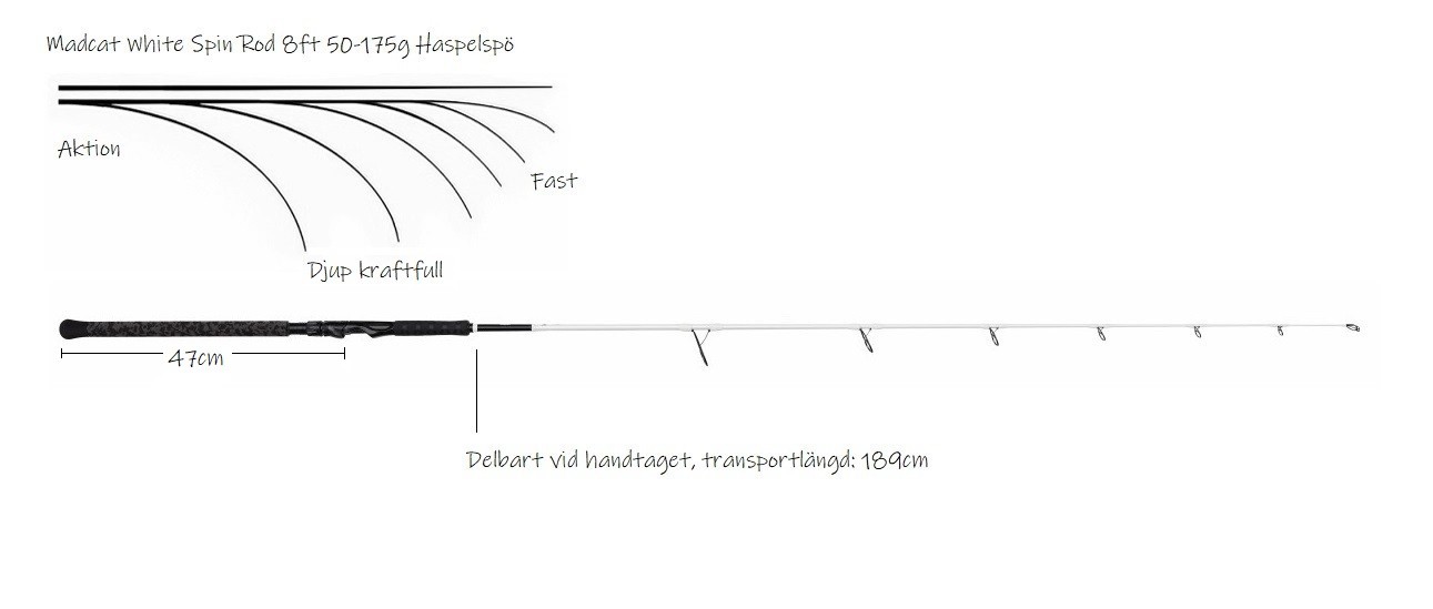 MADCAT White Spin är spön för tuffa tag, designade för det krävande fisket efter stor mal, designen och styrkan i klingan gör de till ett utmärkt spö till lättare havsfiske med jiggar efter arter som hälleflundra, seg och torsk. White serien har en X-wrap-krympslang över det hårda EVA-handtaget, vilket ger förbättrat grepp och gör det enklare att hålla rent. Spöholken, delningen är precis ovanför handtaget, vilket ökar hållbarheten under stark press och bibehåller den övergripande styrkan i klingan.