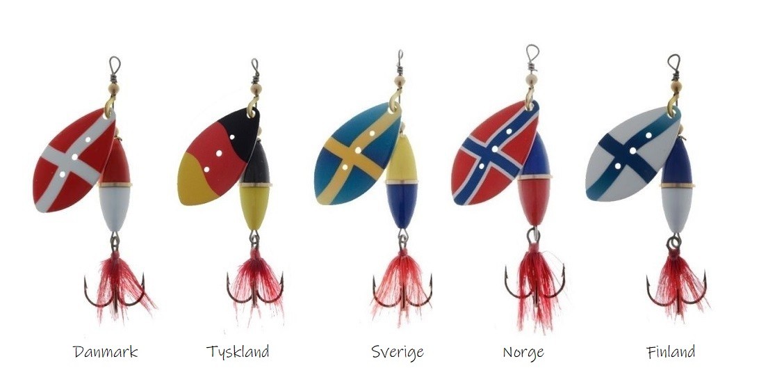 Wippspinnaren i dessa lands-färger är verkligen inget långskott utan en riktig höjdare som present, men även en säker fiskfångare när du önskar fånga: abborre, gädda. öring, regnbåge, röding och harr.
