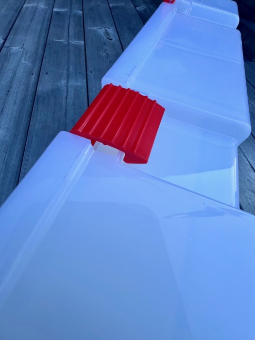 Denna låda har "Pro Latch", vilket innebär att låsningen inte är gjuten med med själva lådan så att de inte går av som den ursprungliga, gamla designen.
