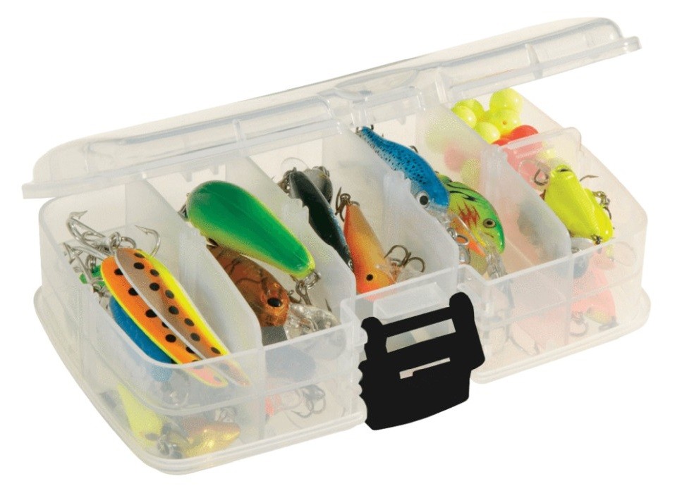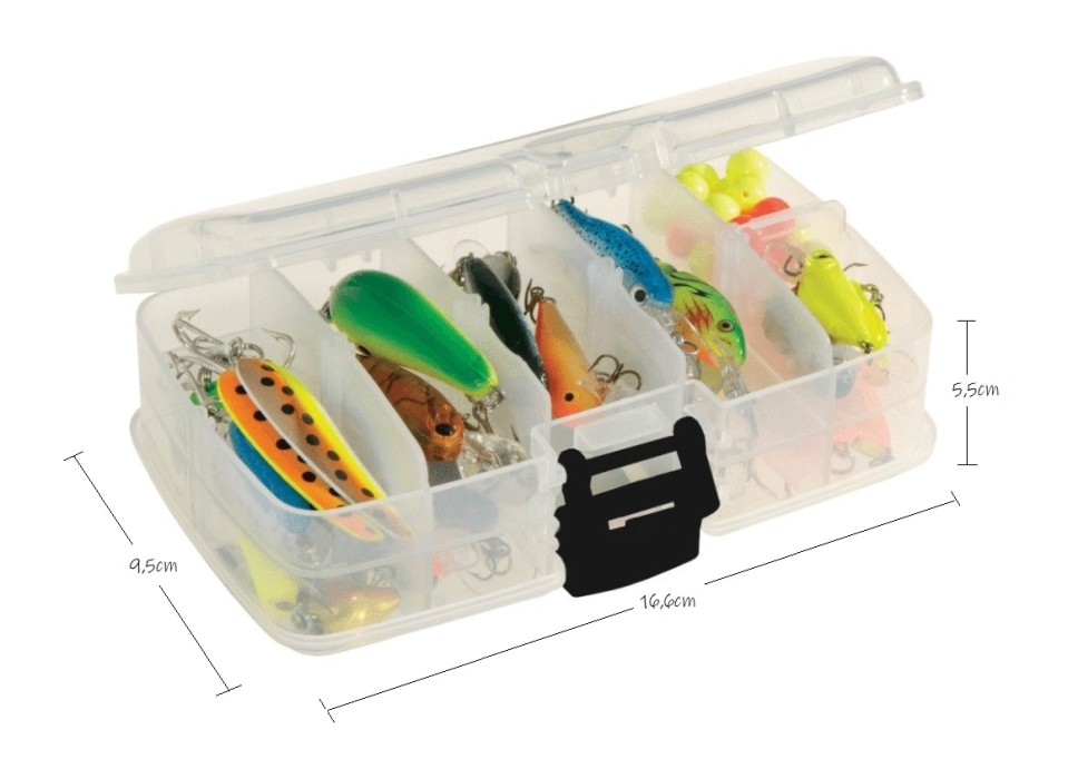 Mycket bra och rymlig "liten ask" utrustad med rejäla spännen. Perfekt för den mobila fiskaren som smyger runt en liten sjö eller tjärn. Fem tvärgående fack per sida med lösa skiljeväggar som ger dig möjlighet att dela facken till tio per sida.