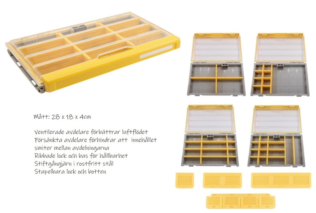 Över två år av utveckling och otaliga timmar av forskning har lett till ett lagringssystem som löser alla större problem som den seriöse sportfiskaren stöter på vid förvaring av beten och tillbehör. Med en serie av tio lådor som erbjuder både allmän betesförvaring och specialförvaring som passar in i det nuvarande Plano-systemet, kommer de att förlänga livslängden på din utrustning och ge dig en "edge" ute på vattnet.