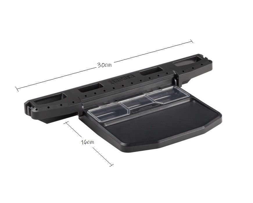 Den har tre förvaringsutrymmen med genomskinliga lock, hål för verktyg, krokhållare och baksidan är klädd med foam så att du kan hänga skedar, rödingblänk, pirkar och liknande.