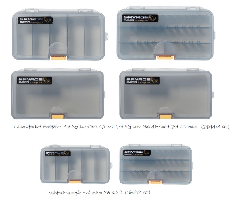 - I huvudfacket 1st SG Lure Box 4A och 1 st SG Lure Box 4B samt 2st 4C boxar (21x14x4 cm)