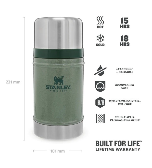 Vacuum Food Jar har Stanleys klassika design med ett riktigt robust handtag och rostfri konstruktion. De dubbla väggarna håller innehållet varmt upp till 14 timmar alternativt kallt upp till 16 timmar.