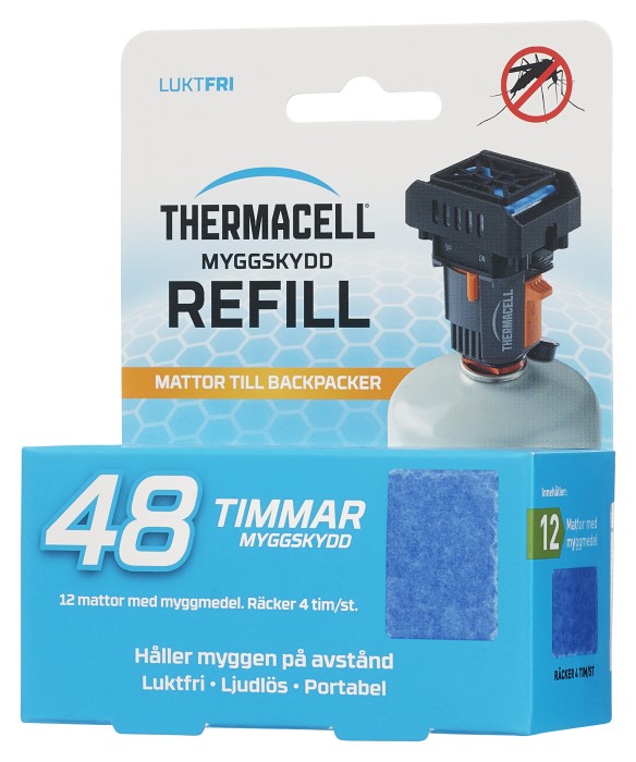 Refill att använda till Thermacell Backpacker. Förpackningen innehåller 12 mattor med myggskyddsmedel som varar i upp till 48 timmar.