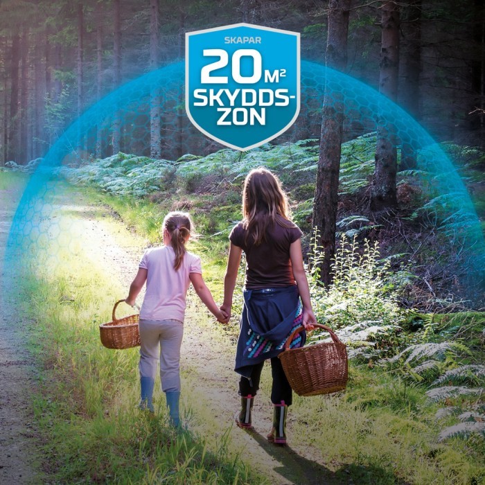 Myggskyddet utsöndrar ett ljudlöst och luktfritt myggmedel som håller myggen borta på en radie av ca 20m2.