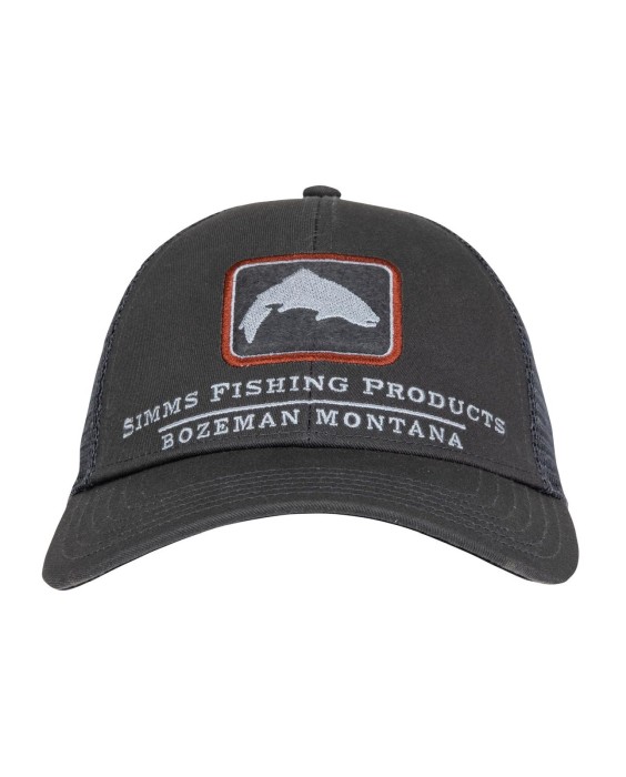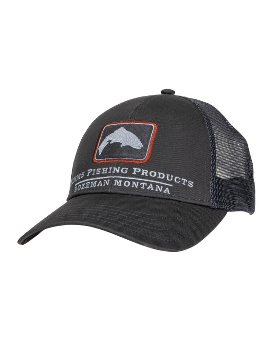 Snygg, stilren truckerkeps från Simms med ett motiv av en öring på framsidan.