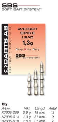 Darts weight Spike är en spikformad vikt. Fungerar utmärkt att balansera eller vikta maskjiggar och andra gummibeten.